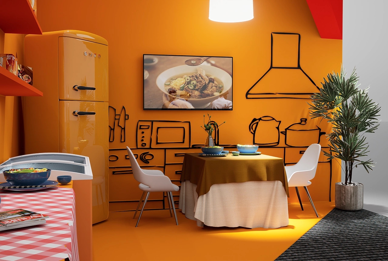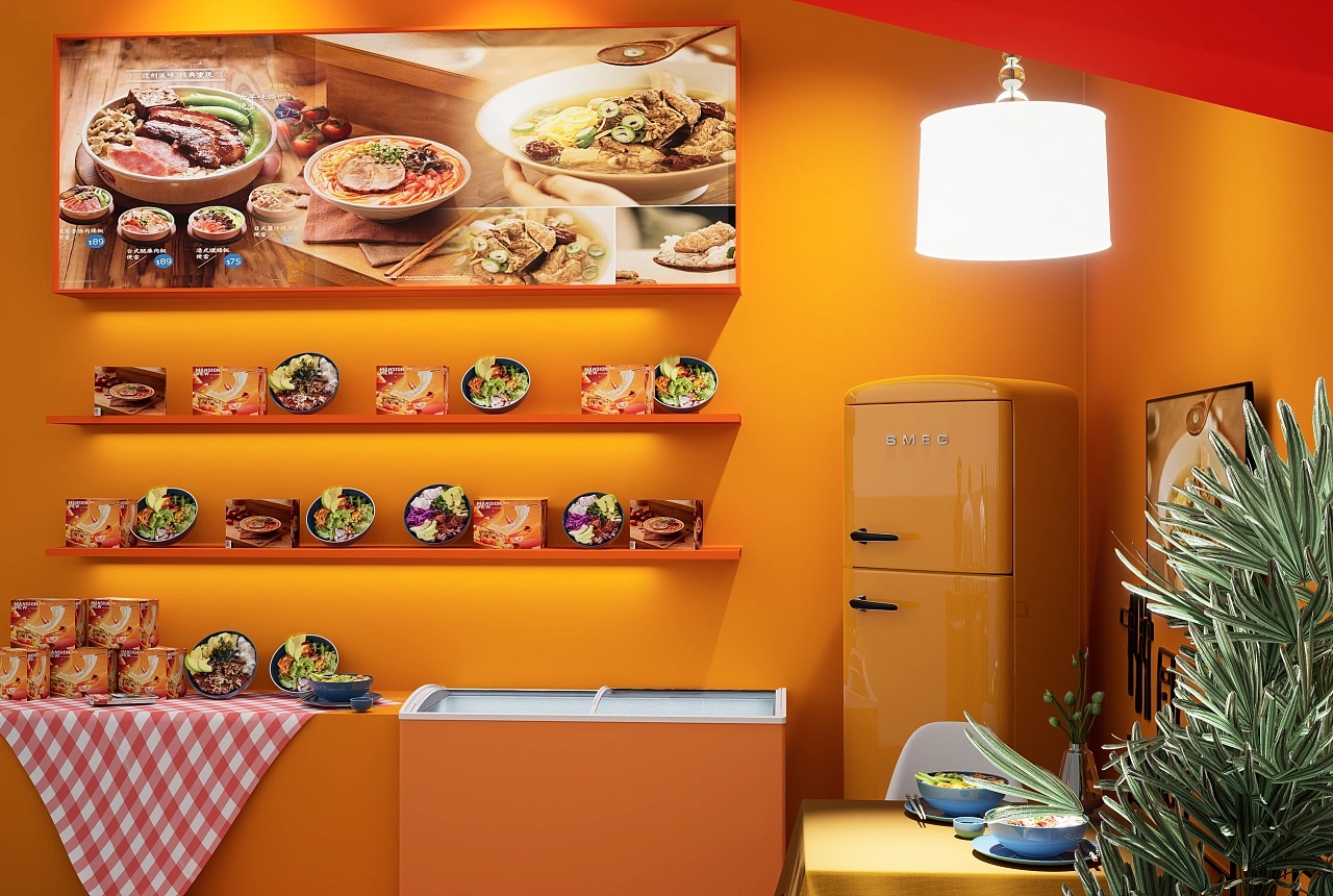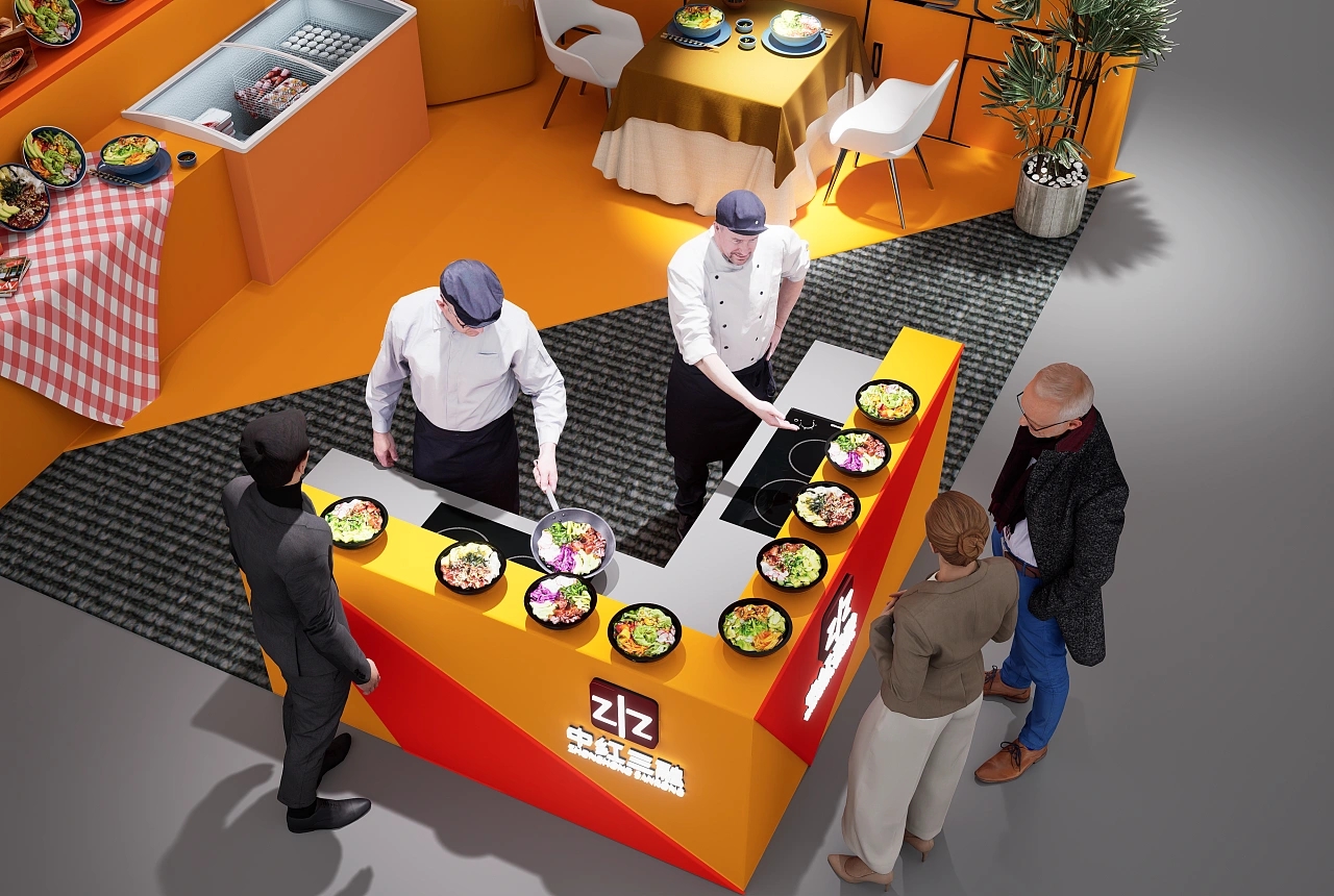 該展臺搭建面積為36平方米,展臺設計使用了紅色和橙色作為主色彩,視覺效果十分亮眼吸睛,后方搭配了高清燈箱以及展示架,還有兩種冰箱用于儲存展示的產品。該展臺前臺接待區布置了四個電磁爐,方便客戶感受預制菜產品的便捷以及味道,促進訂單成交量的提升。