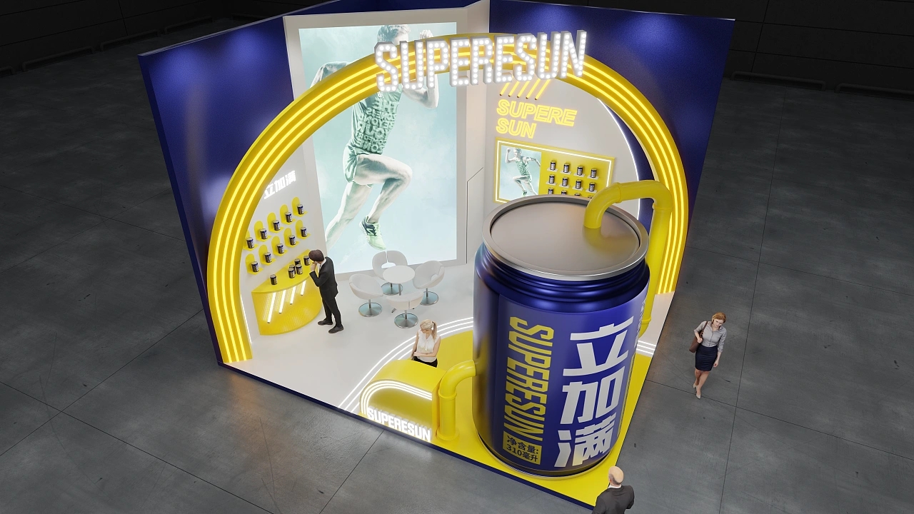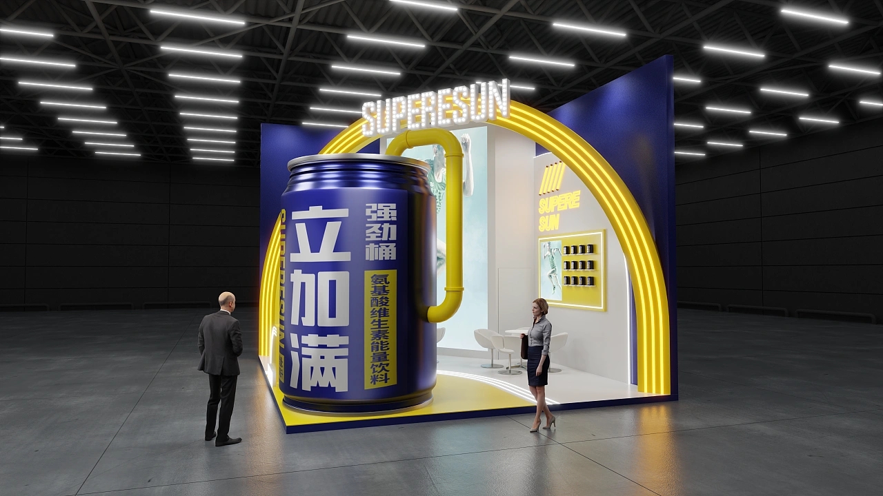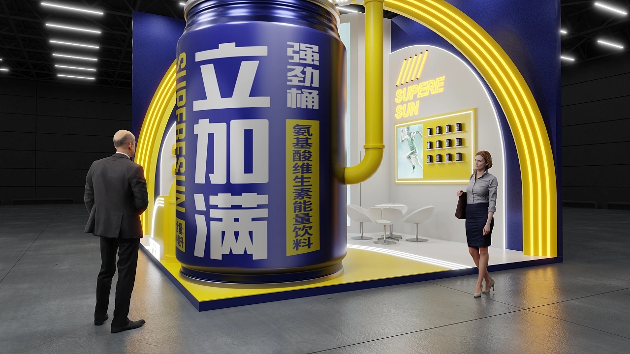展臺設計要怎么打造企業特色展臺,是很多企業都想要解決的問題。該展臺設計搭建結合了該企業主打產品的外形與運動元素進行設計,在展臺前方搭建了一個巨型的產品模型,能快速抓取來往的會展觀眾的視線,打造成該展臺設計的焦點。整個展臺采用產品使用的藍色和黃色進行色彩搭配,展臺立面墻上搭建了較高的軟膜燈箱,用于展示該企業的文化,促進產品的宣傳。